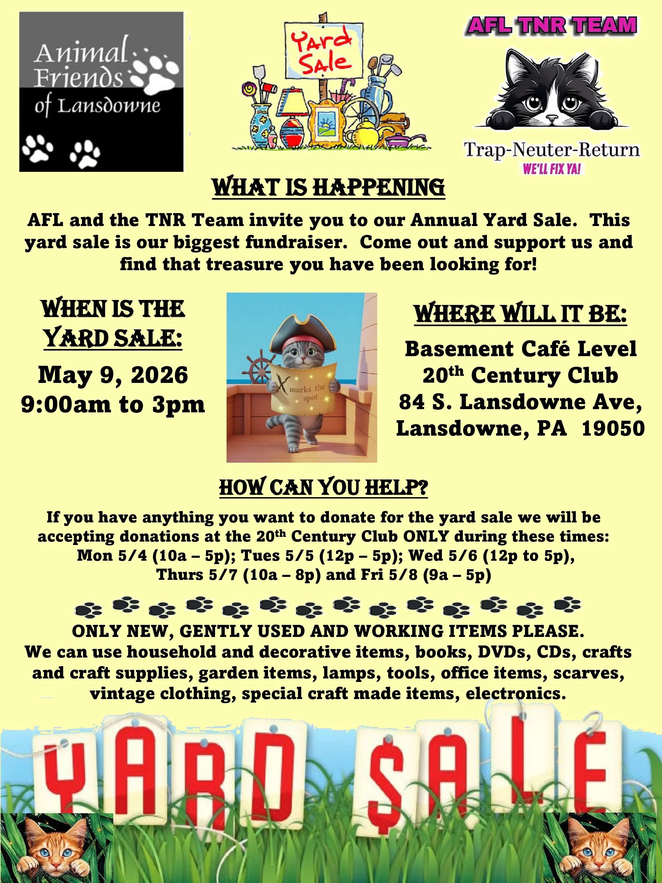 Back to All Events Annual Yard Sale Saturday, May 9, 2026 9:00 AM 3:00 PM Basement Café Level 20th Century Club 84 South Lansdowne Avenue Lansdowne, PA, 19050 United States (map) Google Calendar ICS
